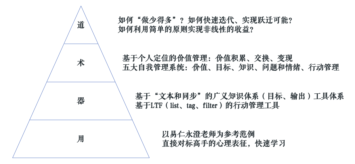 以上内容主要来自于自我管理系统的五大组成部分:价值管理、目标管理、知识管理、问题和情绪管理、行动管理,并结合价值变化的三大环节:价值积累、价值交换、价值变现,融通形成的完整课程体系。